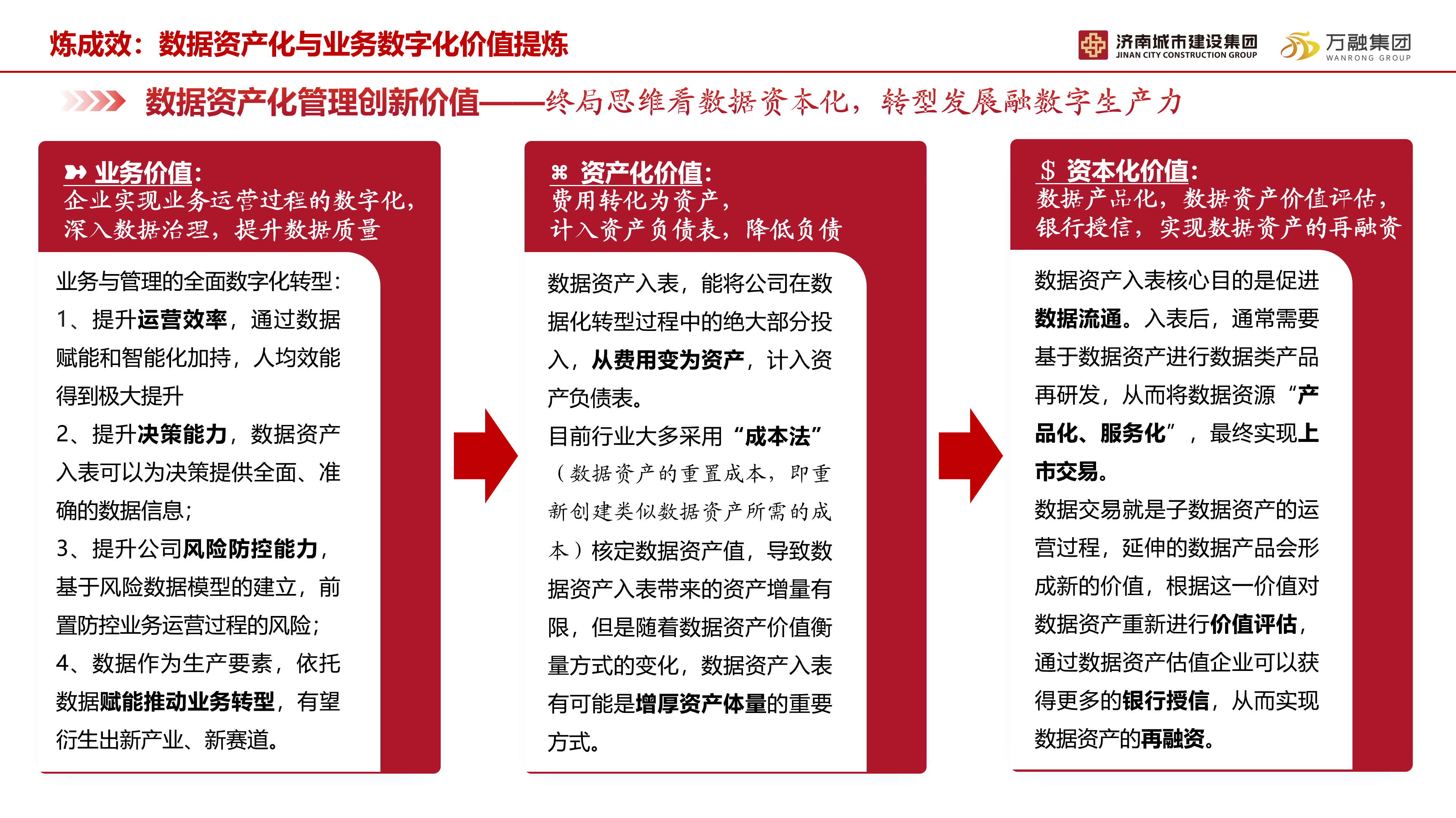 萬融集團高度重視數據資產的運營管理和價值創造,通過持續加強政策研究、行業交流,開展相關理論和實踐探索,明確了數據資源化、資產化、產品化實施路徑。同時,基于自身數據治理的實踐經驗,積極參與濟南城市建設集團高質量發展管理創新案例評審、“技能興魯”職業技能大賽等典型應用案例和創新場景應用,進一步構建數據資產價值體系,數據賦能經營管理提升。